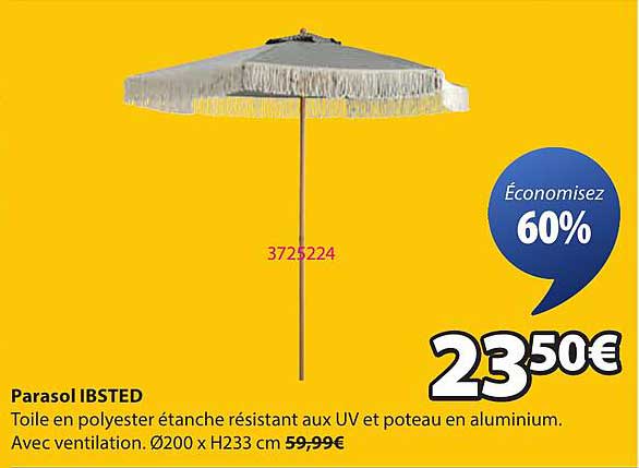 Le parasol IBSTED est l'accessoire indispensable pour profiter pleinement de vos journées ensoleillées. Que ce soit pour une petite sieste dans le jardin ou un repas en extérieur, ce parasol vous offre une protection optimale contre les rayons UV tout en ajoutant une touche d'élégance à votre espace extérieur. Actuellement proposé à seulement 23,50€, c'est une offre à ne pas manquer !