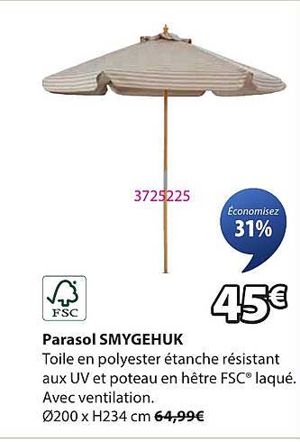 Le parasol SMYGEHUK se distingue par sa structure en hêtre FSC® laqué, garantissant une durabilité et une résistance aux intempéries. Ses dimensions de 200 cm de diamètre et 234 cm de hauteur en font un accessoire idéal pour couvrir une large zone. Avec sa ventilation intégrée, vous pourrez profiter d'une circulation d'air agréable même pendant les jours les plus chauds.