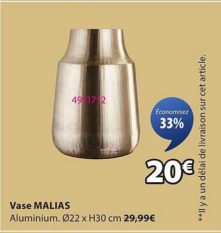 Le vase MALIAS est une pièce incontournable pour embellir votre intérieur. Fabriqué en aluminium, ce vase allie élégance et modernité. Profitez de cette offre exceptionnelle à seulement 20€, soit une économie de 33% par rapport au prix habituel.