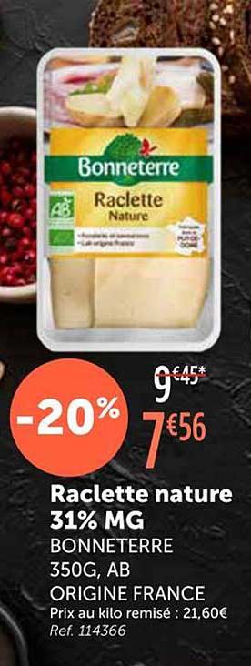 La saison des raclettes arrive à grands pas, et quoi de mieux que la Raclette nature de Bonneterre pour régaler vos convives ? Avec une réduction de 20%, cette offre vous permet de vous faire plaisir tout en respectant votre budget. Profitez de ce fromage au lait de vache, bio et d'origine française, parfait pour vos soirées d'hiver.