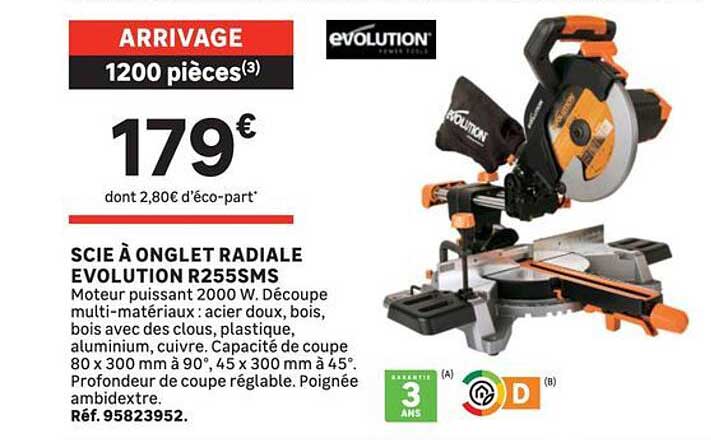 Découvrez la scie à onglet radiale Evolution R255SMS, un outil indispensable pour tous vos travaux de précision. Parfaitement adaptée aux professionnels comme aux bricoleurs passionnés, cette scie vous permettra de réaliser des coupes parfaites grâce à son moteur puissant de 2000 W. Profitez de cette offre exceptionnelle, valable jusqu'au 4 novembre 2025.