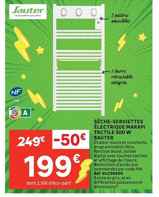Découvrez dès maintenant la offre Sèche-serviettes électrique Marapi tactile 500 W Sauter dans le catalogue de Leroy Merlin. Cette offre est valable du 15/10/2025 au 04/11/2025.