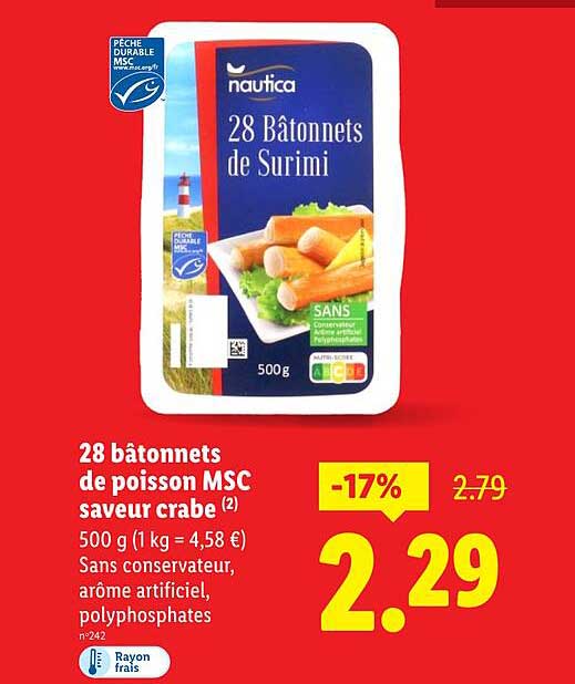 Découvrez l'offre de 28 Bâtonnets De Poisson Msc Saveur Crabe chez Lidl! Cette offre fantastique est maintenant disponible dans le nouveau catalogue de Lidl. Profitez de cette occasion et économisez considérablement sur votre achat.
