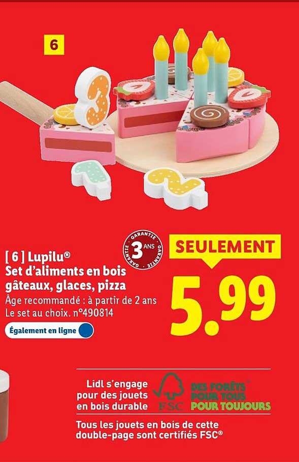 Découvrez dès maintenant la offre [ 6 ] Lupilu® Set d’aliments en bois gâteaux, glaces, pizza dans le catalogue de Lidl. Cette offre est valable du 27/10/2025 au 30/10/2025.