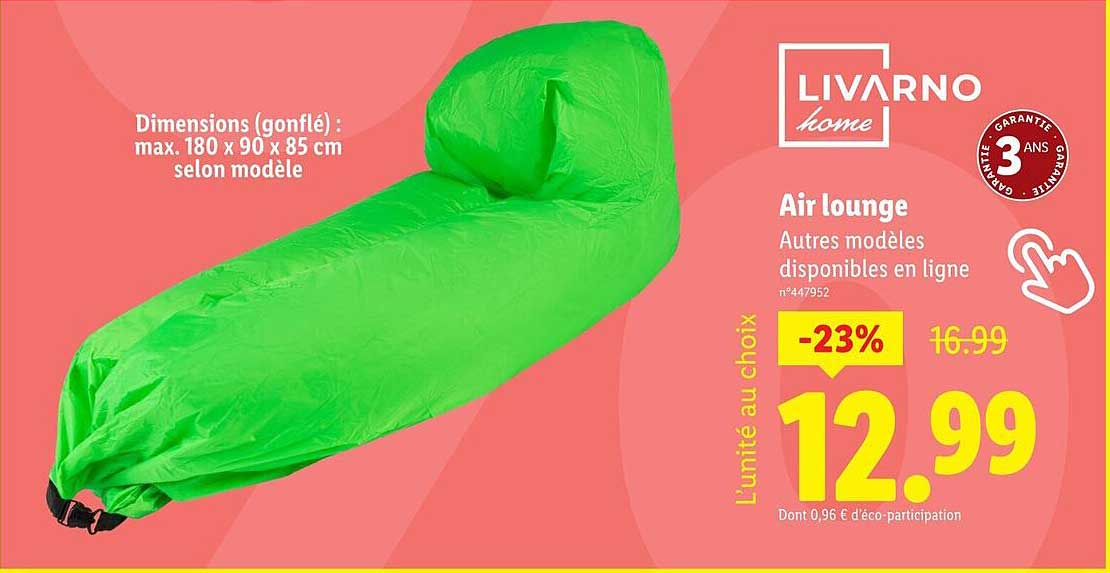 Découvrez dès maintenant la offre Air lounge dans le catalogue de Lidl. Cette offre est valable du 23/06/2025 au 26/06/2025.