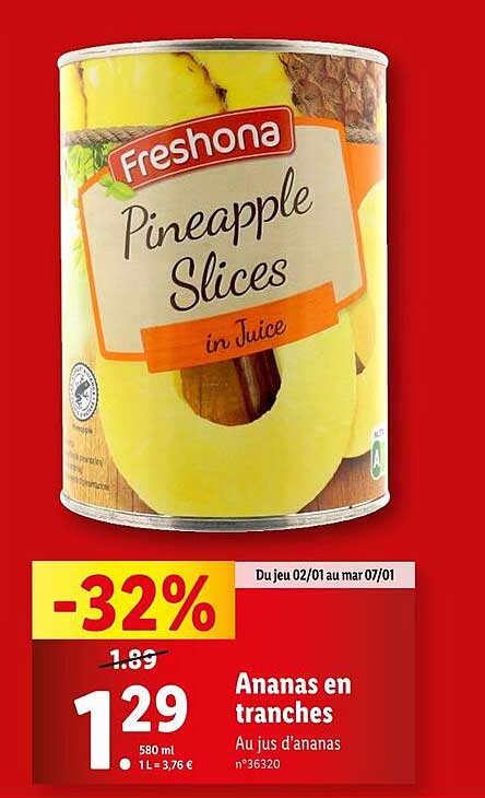 Découvrez dès maintenant la offre Ananas en tranches dans le catalogue de Lidl. Cette offre est valable du 02/01/2025 au 07/01/2025.