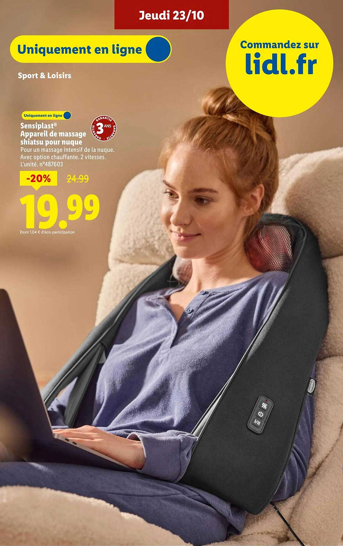 Découvrez dès maintenant la offre Appareil de massage shiatsu pour nuque dans le catalogue de Lidl. Cette offre est valable du 20/10/2025 au 23/10/2025.