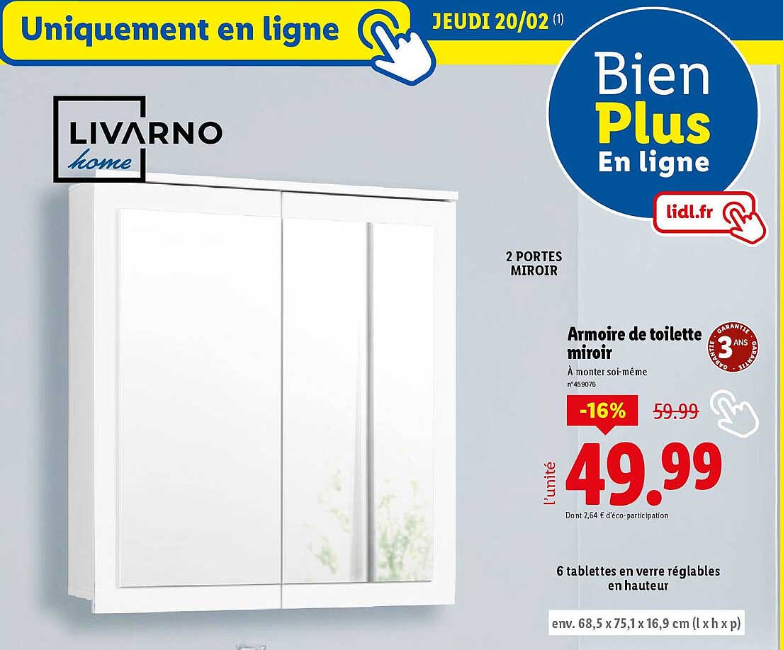 Découvrez dès maintenant la offre Armoire de toilette miroir dans le catalogue de Lidl. Cette offre est valable du 20/02/2025 au 26/02/2025.