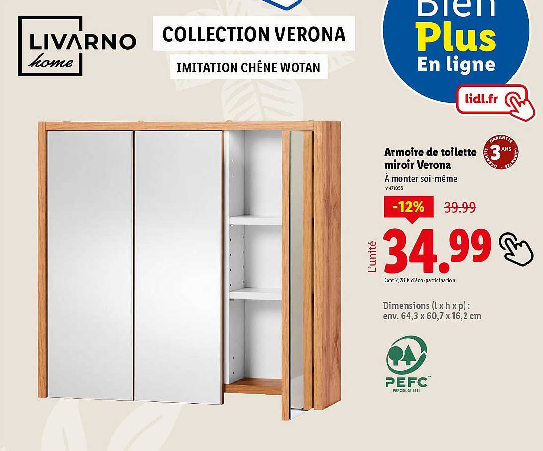 Actuellement, l'Armoire de toilette miroir Verona est proposée à 34,99€, soit une réduction de 12% par rapport à son prix habituel de 39,99€. C'est une belle opportunité pour moderniser votre intérieur tout en faisant des économies !