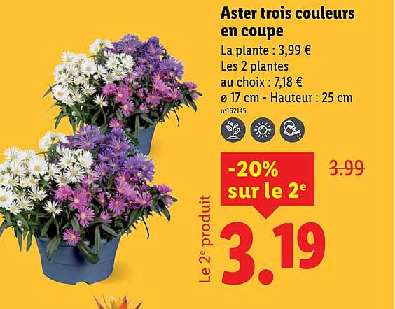 Découvrez dès maintenant la offre Aster trois couleurs en coupe dans le catalogue de Lidl. Cette offre est valable du 17/07/2025 au 23/07/2025.