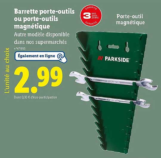 Si vous cherchez à organiser efficacement vos outils, la barrette porte-outils ou porte-outils magnétique de Parkside est une solution idéale. Cet accessoire pratique vous permettra de garder vos outils à portée de main, tout en optimisant l'espace de votre garage ou atelier. Ne manquez pas cette offre exceptionnelle qui ne dure que quelques jours !