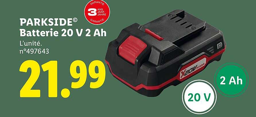 Découvrez la batterie PARKSIDE 20 V 2 Ah, une solution parfaite pour alimenter vos outils sans fil. Idéale pour ceux qui souhaitent compléter leur équipement, cette batterie garantit performance et durabilité. Un achat indispensable pour réaliser tous vos projets de bricolage avec efficacité !
