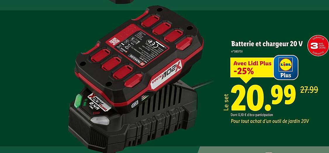 Découvrez l'offre de Batterie Et Chargeur 20 V chez Lidl! Cette offre fantastique est maintenant disponible dans le nouveau catalogue de Lidl. Profitez de cette occasion et économisez considérablement sur votre achat.