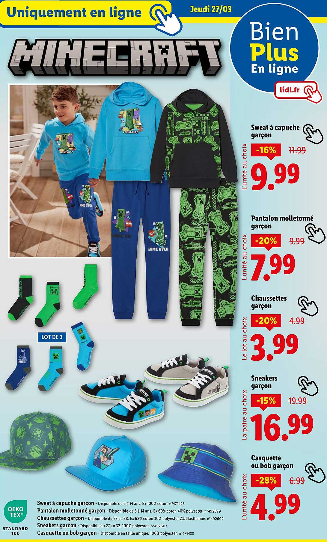 Êtes-vous prêt à plonger dans l'univers fascinant de Minecraft ? Lidl vous propose une sélection incroyable de vêtements et d'accessoires pour enfants, à des prix imbattables ! Cette offre, valable du 27 mars au 2 avril 2025, comprend des sweats, pantalons, chaussettes et sneakers, tous conçus pour les jeunes fans. C'est l'occasion rêvée de s'assurer que vos enfants soient aussi stylés que confortables pour leurs aventures quotidiennes.