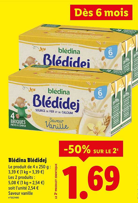 Découvrez l'offre de Blédina Blédidej chez Lidl! Cette offre fantastique est maintenant disponible dans le nouveau catalogue de Lidl. Profitez de cette occasion et économisez considérablement sur votre achat.