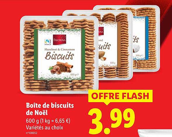 Les fêtes approchent et il est temps de se faire plaisir avec des douceurs ! Lidl vous propose une offre alléchante sur les Boîtes de biscuits de Noël de la marque Favorina. Avec un prix exceptionnel de seulement 3,99 €, il serait dommage de ne pas en profiter ! Ces biscuits sont parfaits pour partager des moments conviviaux en famille ou entre amis.