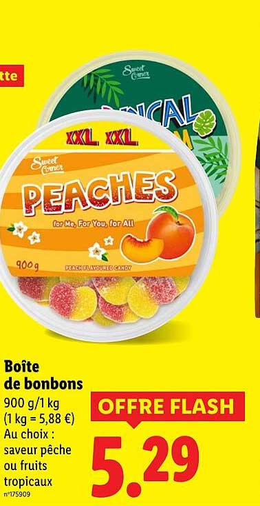 Vous avez envie d'une douceur irrésistible ? Ne manquez pas cette offre exceptionnelle sur la boîte de bonbons Sweet Corner, disponible en saveur pêche ou fruits tropicaux. Avec 900 g de délicieuses confiseries, cette boîte est parfaite pour toutes les occasions : anniversaires, soirées cinéma ou simplement pour se faire plaisir. Profitez de cette offre flash qui ravira petits et grands !