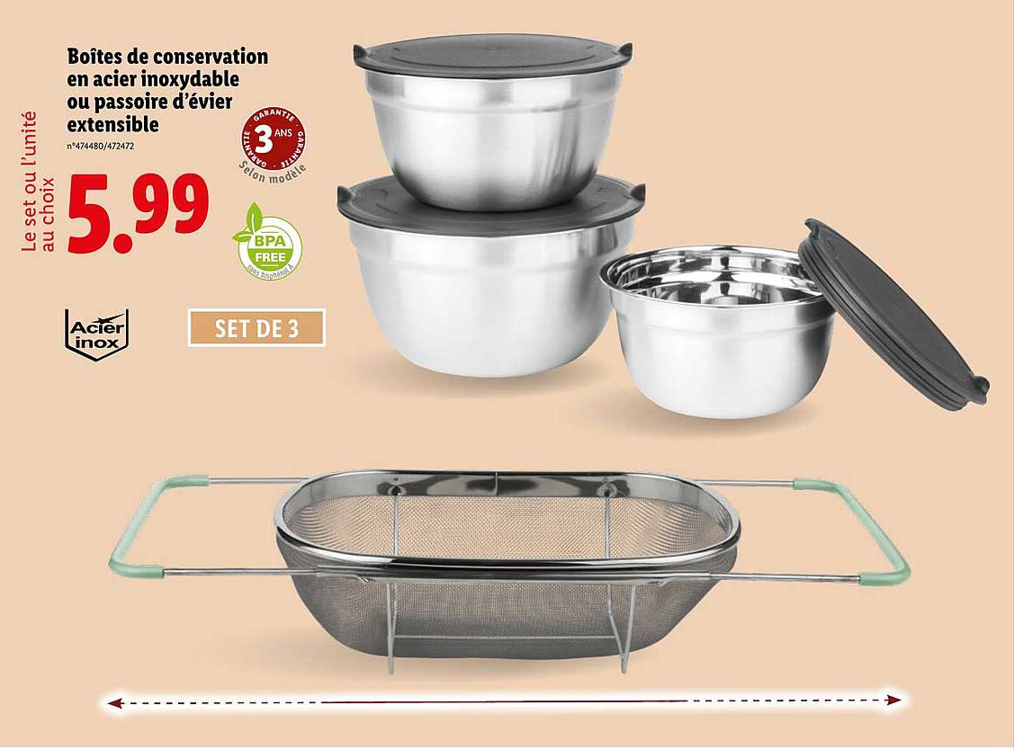 Découvrez dès maintenant la offre Boîtes de conservation en acier inoxydable ou passoire d'évier extensible dans le catalogue de Lidl. Cette offre est valable du 27/03/2025 au 02/04/2025.
