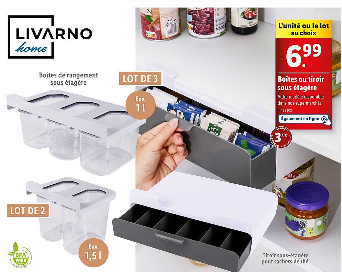 Découvrez dès maintenant la offre Boîtes ou tiroir sous étagère dans le catalogue de Lidl. Cette offre est valable du 15/01/2025 au 21/01/2025.
