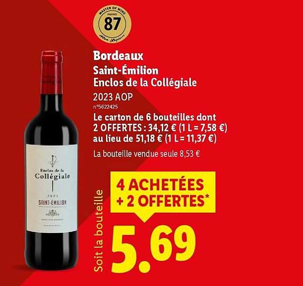 Découvrez une occasion exceptionnelle de savourer un grand vin avec l'offre actuelle de Lidl ! Le Bordeaux Saint-Émilion Enclos de la Collégiale, millésime 2023, est proposé à un prix irrésistible. Avec cette promotion, vous pouvez remplir votre cave tout en réalisant des économies notables.