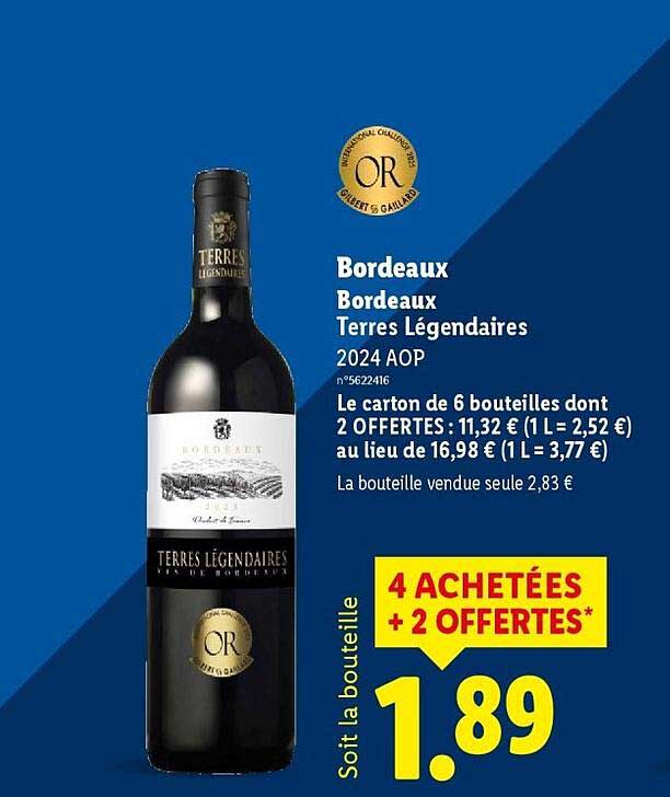 Découvrez dès maintenant la offre Bordeaux Terres Légendaires 2024 AOP dans le catalogue de Lidl. Cette offre est valable du 04/09/2025 au 10/09/2025.