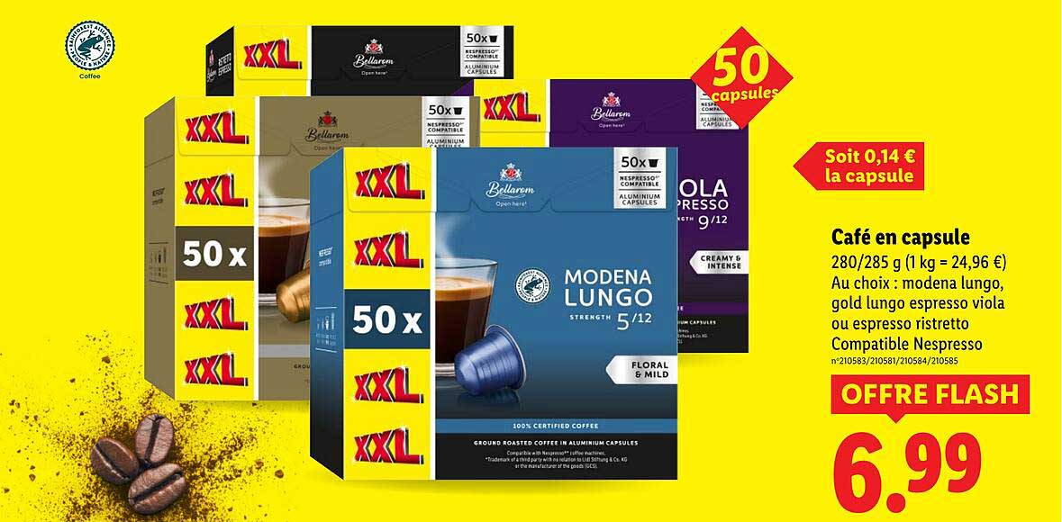 Si vous êtes amateur de café, cette offre de capsules chez Lidl est faite pour vous ! Profitez de 50 capsules de Café Bellarom, parfaitement compatibles avec vos machines Nespresso. Que vous préfériez le modena lungo, le gold lungo ou un espresso ristretto, cette sélection saura combler toutes vos envies. Avec un prix unique de 6,99€, vous êtes assuré d'obtenir une qualité de café à un tarif très attractif.