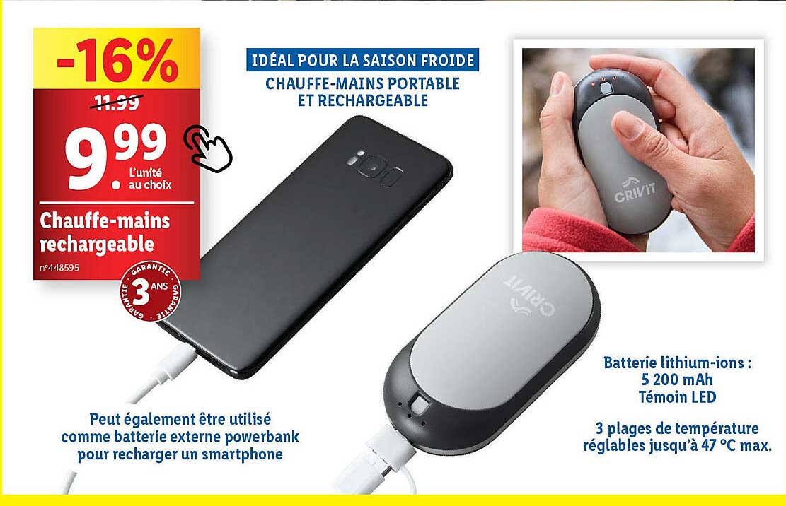 Découvrez dès maintenant la offre Chauffe-mains rechargeable dans le catalogue de Lidl. Cette offre est valable du 09/10/2024 au 15/10/2024.