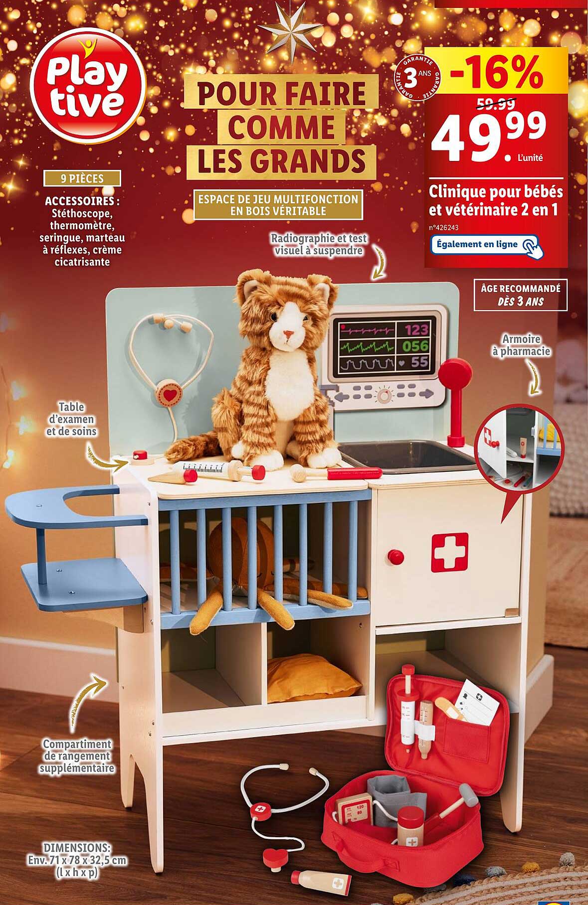 Découvrez l'offre de Clinique Pour Bébés Et Vétérinaire 2 En 1 chez Lidl! Cette offre fantastique est maintenant disponible dans le nouveau catalogue de Lidl. Profitez de cette occasion et économisez considérablement sur votre achat.