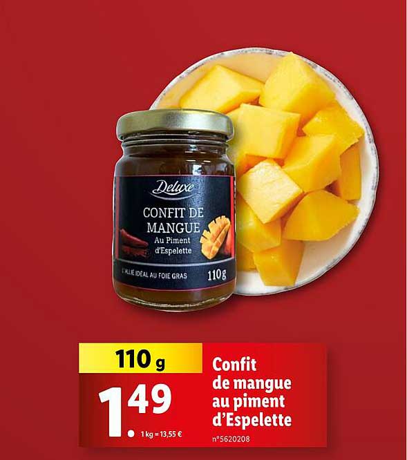 Découvrez l'offre de Confit De Mangue Au Piment D'espelette chez Lidl! Cette offre fantastique est maintenant disponible dans le nouveau catalogue de Lidl. Profitez de cette occasion et économisez considérablement sur votre achat.