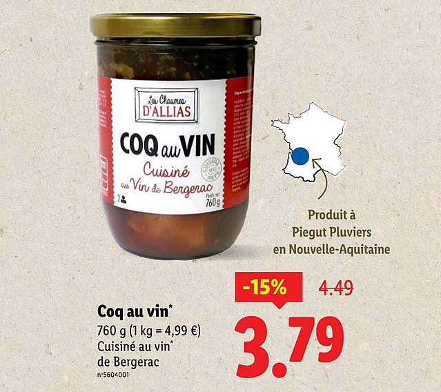 Découvrez la superbe offre de Coq Au Vin* dans le nouveau catalogue de Lidl. En plus de cette offre, vous trouverez de nombreuses autres réductions attrayantes. Vous pouvez facilement commander le Coq Au Vin* en ligne via le site web de Lidl ou l'acheter dans un magasin près de chez vous.