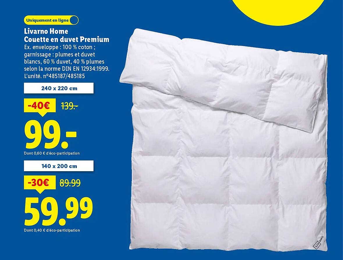 Découvrez dès maintenant la offre Couette en duvet Premium Livarno Home dans le catalogue de Lidl. Cette offre est valable du 27/10/2025 au 30/10/2025.