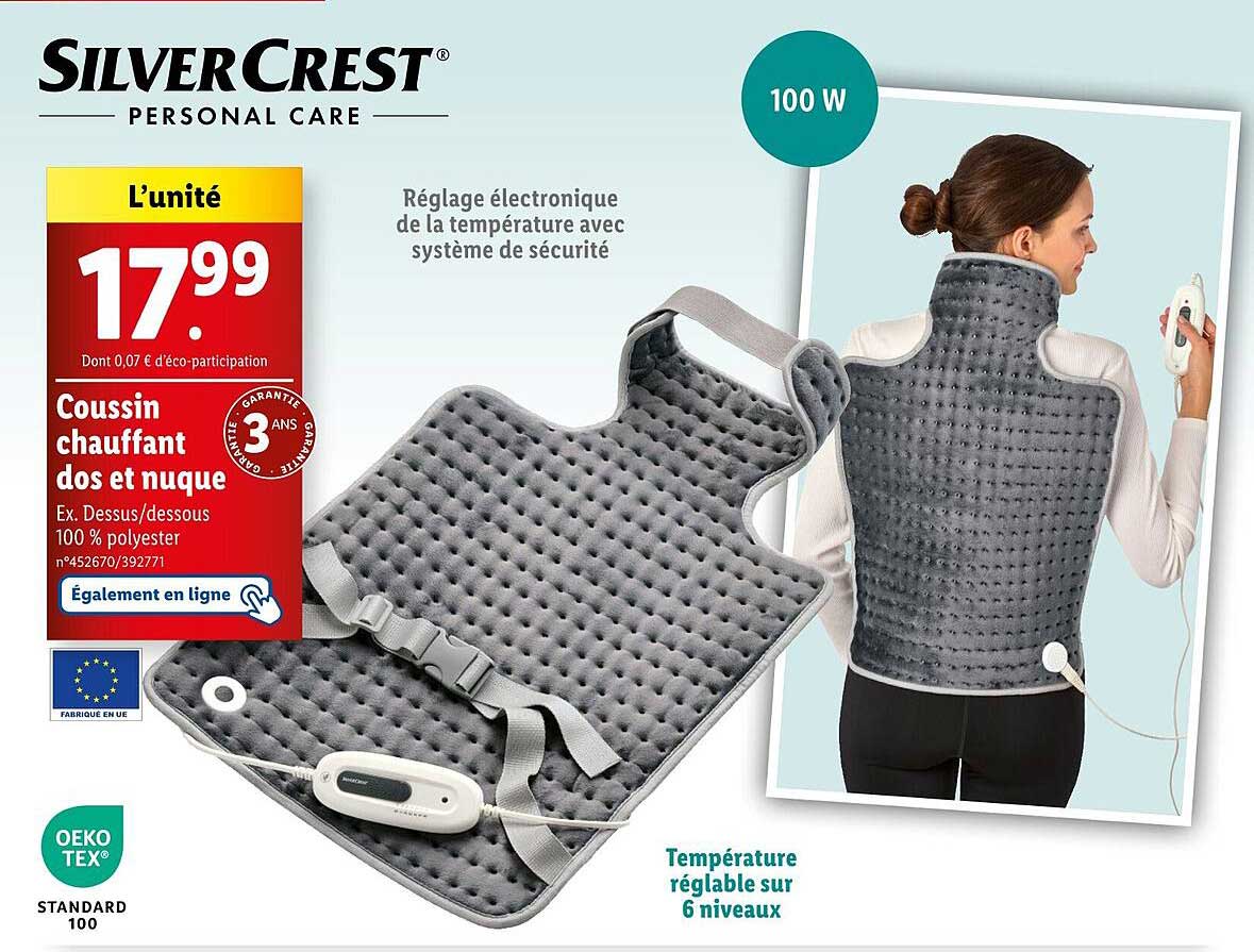 Découvrez dès maintenant la offre Coussin chauffant dos et nuque dans le catalogue de Lidl. Cette offre est valable du 02/01/2025 au 06/01/2025.
