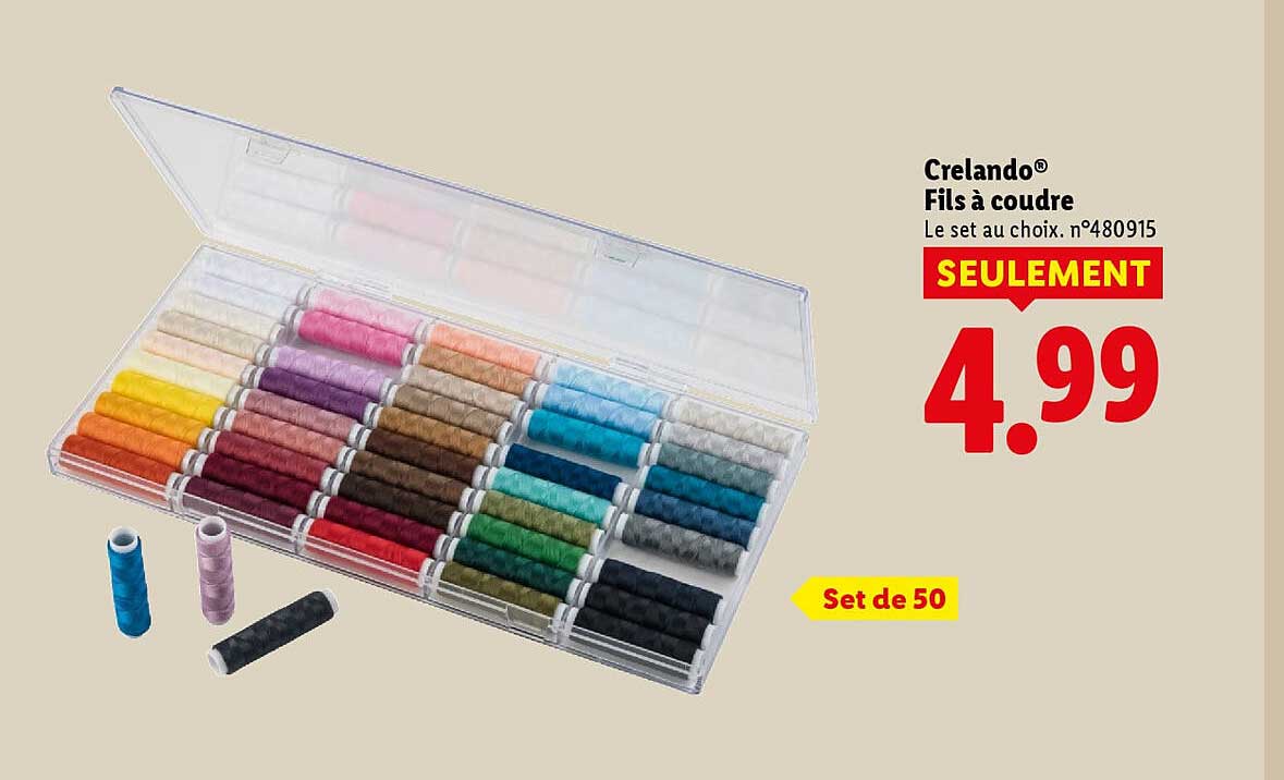 Découvrez dès maintenant la offre Crelando® Fils à coudre dans le catalogue de Lidl. Cette offre est valable du 20/10/2025 au 23/10/2025.