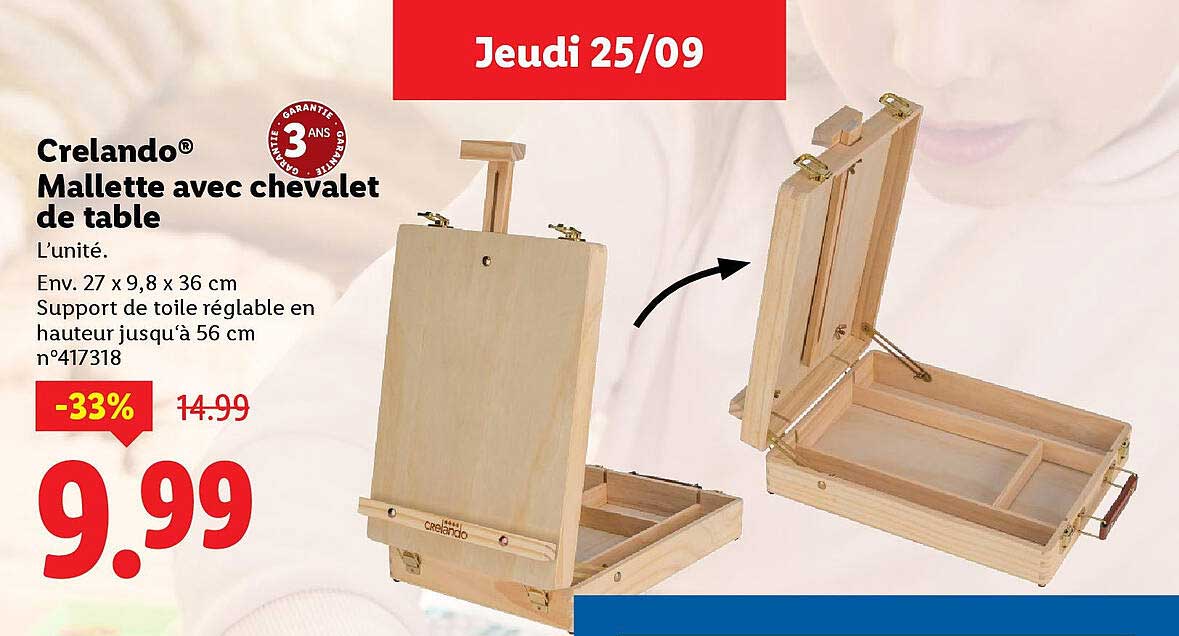 Découvrez dès maintenant la offre Crelando® Mallette avec chevalet de table dans le catalogue de Lidl. Cette offre est valable du 25/09/2025 au 01/10/2025.
