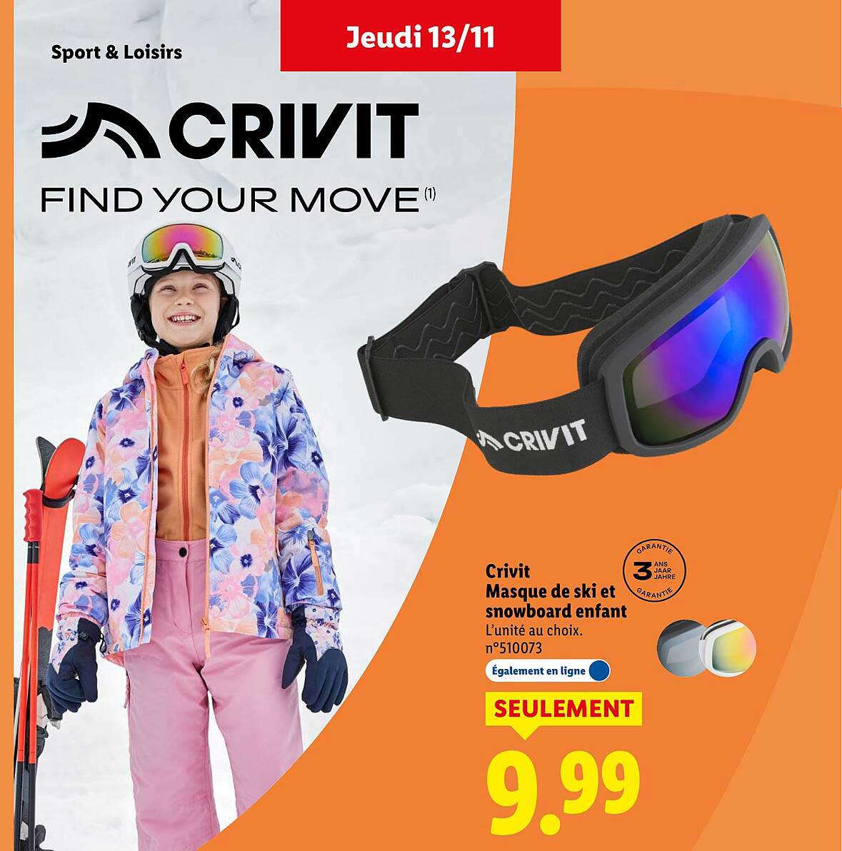 Découvrez dès maintenant la offre Crivit Masque de ski et snowboard enfant dans le catalogue de Lidl. Cette offre est valable du 13/11/2025 au 17/11/2025.