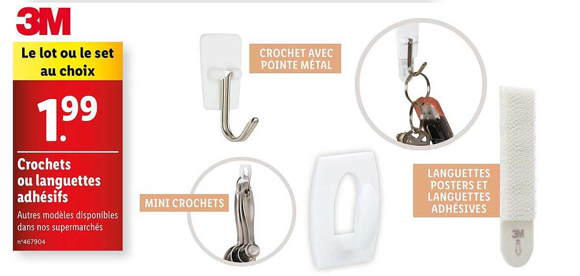 Découvrez l'offre de Crochets Ou Languettes Adhésifs chez Lidl! Cette offre fantastique est maintenant disponible dans le nouveau catalogue de Lidl. Profitez de cette occasion et économisez considérablement sur votre achat.