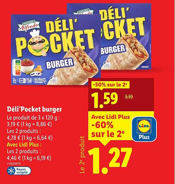 Découvrez la superbe offre de Déli’pocket Burger dans le nouveau catalogue de Lidl. En plus de cette offre, vous trouverez de nombreuses autres réductions attrayantes. Vous pouvez facilement commander le Déli’pocket Burger en ligne via le site web de Lidl ou l'acheter dans un magasin près de chez vous.