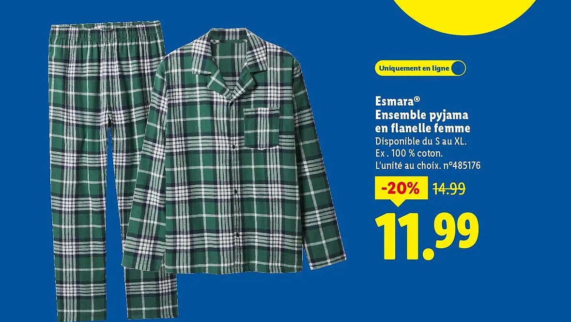 Ce magnifique pyjama est proposé au prix de 11,99 €, soit une réduction de 20 % par rapport à son prix habituel de 14,99 €. C'est l'occasion rêvée de renouveler votre garde-robe de nuit sans vous ruiner. Avec une telle réduction, il serait dommage de passer à côté de cette offre exceptionnelle !