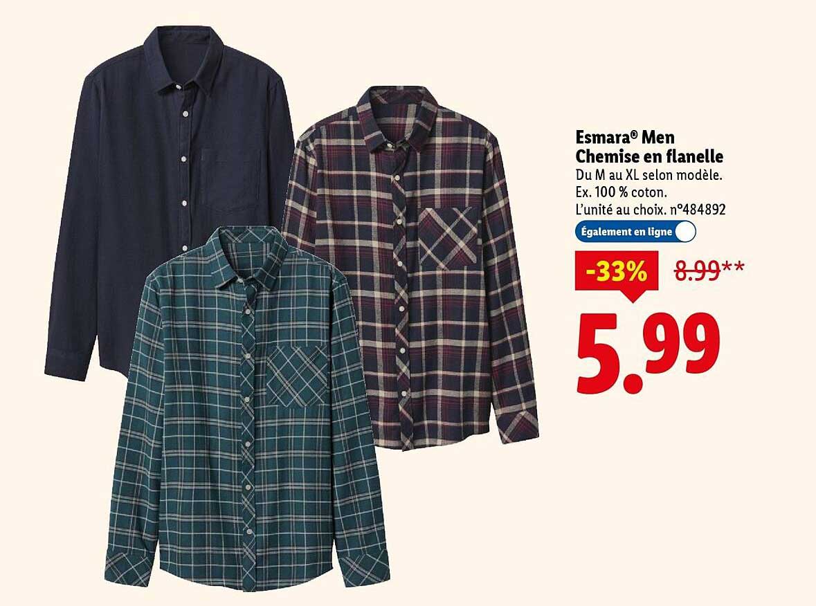 Découvrez notre promotion exceptionnelle sur la chemise en flanelle Esmara® Men, disponible dans une variété de styles allant du M au XL. Fabriquées en 100 % coton, ces chemises allient confort et élégance. Entre le 27 et le 30 octobre 2025, profitez de cette offre à prix réduit, idéale pour les journées d'automne.