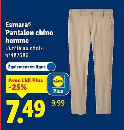 Découvrez l'élégance et le confort du pantalon chino Esmara pour homme, idéal pour toutes les occasions. Disponible chez Lidl, ce pantalon s'adapte à votre style de vie dynamique tout en offrant un excellent rapport qualité-prix. Profitez de cette offre exceptionnelle valide du 2025-11-03 au 2025-11-06, qui vous permet de renouveler votre garde-robe sans vous ruiner.