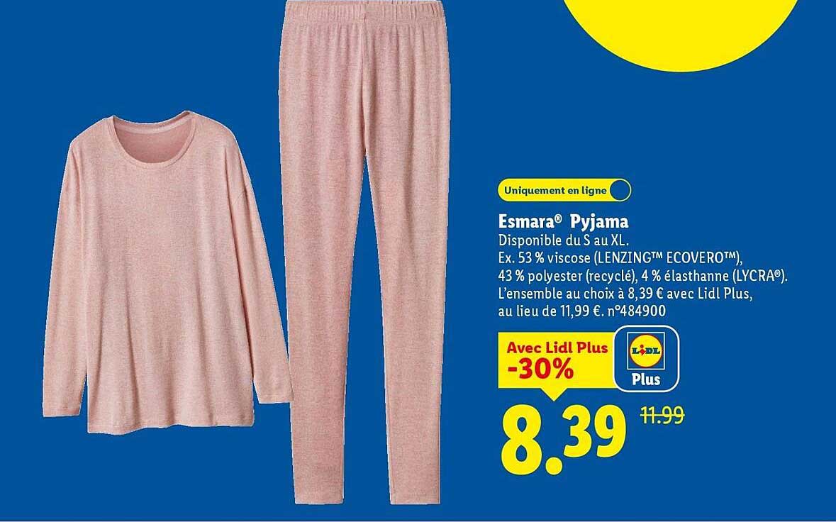 Profitez de cette offre exclusive à seulement 8,39 € avec Lidl Plus, au lieu de 11,99 € ! Cela représente une réduction de 30 %, une opportunité à ne pas manquer pour ceux qui recherchent une bonne affaire de qualité. Comparez ce prix attractif avec d'autres enseignes, et vous verrez que le pyjama Esmara® est une véritable aubaine.