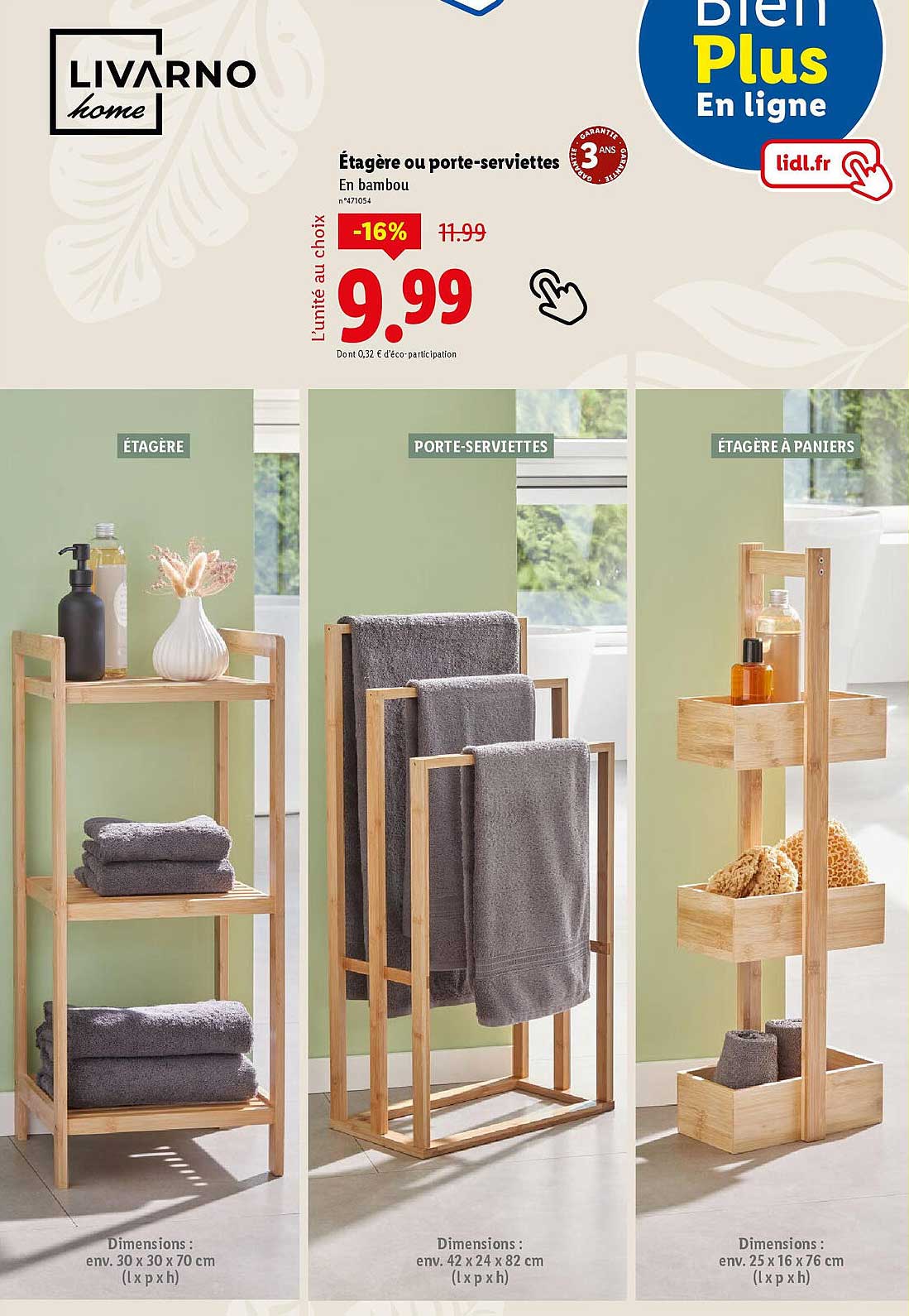 Découvrez dès maintenant la offre Étagère ou porte-serviettes En bambou dans le catalogue de Lidl. Cette offre est valable du 02/04/2025 au 05/04/2025.