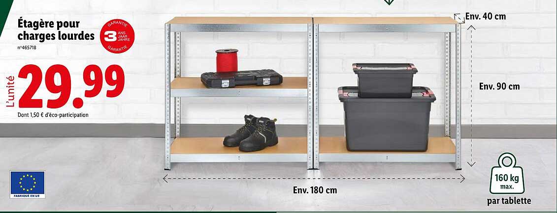 Découvrez l'offre de Étagère Pour Charges Lourdes chez Lidl! Cette offre fantastique est maintenant disponible dans le nouveau catalogue de Lidl. Profitez de cette occasion et économisez considérablement sur votre achat.