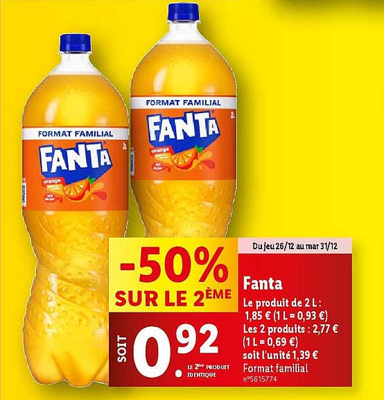Découvrez dès maintenant la offre Fanta orange FORMAT FAMILIAL dans le catalogue de Lidl. Cette offre est valable du 25/12/2024 au 29/12/2024.