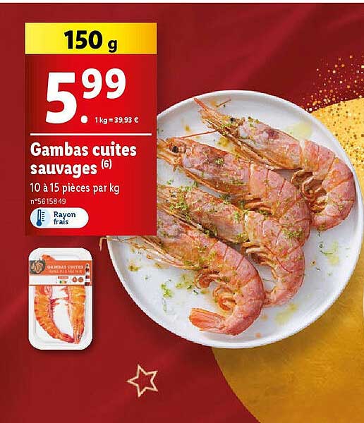 Découvrez dès maintenant la offre Gambas cuites sauvages dans le catalogue de Lidl. Cette offre est valable du 25/12/2024 au 29/12/2024.