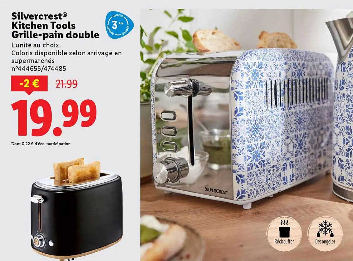 Découvrez le grille-pain double Silvercrest® Kitchen Tools, un indispensable pour vos petits déjeuners. Avec une remise de 2€, ce grille-pain allie design moderne et fonctionnalité. Profitez de tranches de pain parfaitement dorées en un rien de temps !