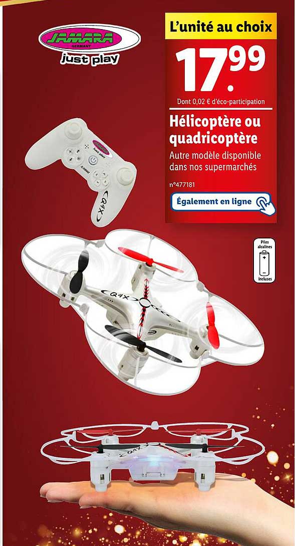 Découvrez l'offre de Hélicoptère Ou Quadricoptère chez Lidl! Cette offre fantastique est maintenant disponible dans le nouveau catalogue de Lidl. Profitez de cette occasion et économisez considérablement sur votre achat.