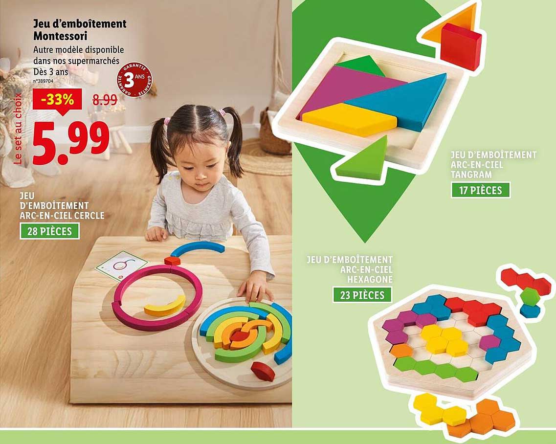 Découvrez dès maintenant la offre Jeu d’emboîtement Montessori dans le catalogue de Lidl. Cette offre est valable du 07/04/2025 au 10/04/2025.
