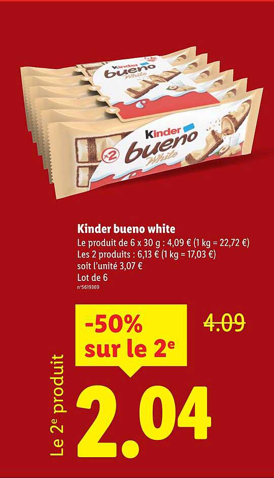 Découvrez l'offre de Kinder Bueno White chez Lidl! Cette offre fantastique est maintenant disponible dans le nouveau catalogue de Lidl. Profitez de cette occasion et économisez considérablement sur votre achat.