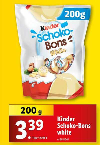 Découvrez l'offre de Kinder Schoko-Bons White chez Lidl! Cette offre fantastique est maintenant disponible dans le nouveau catalogue de Lidl. Profitez de cette occasion et économisez considérablement sur votre achat.